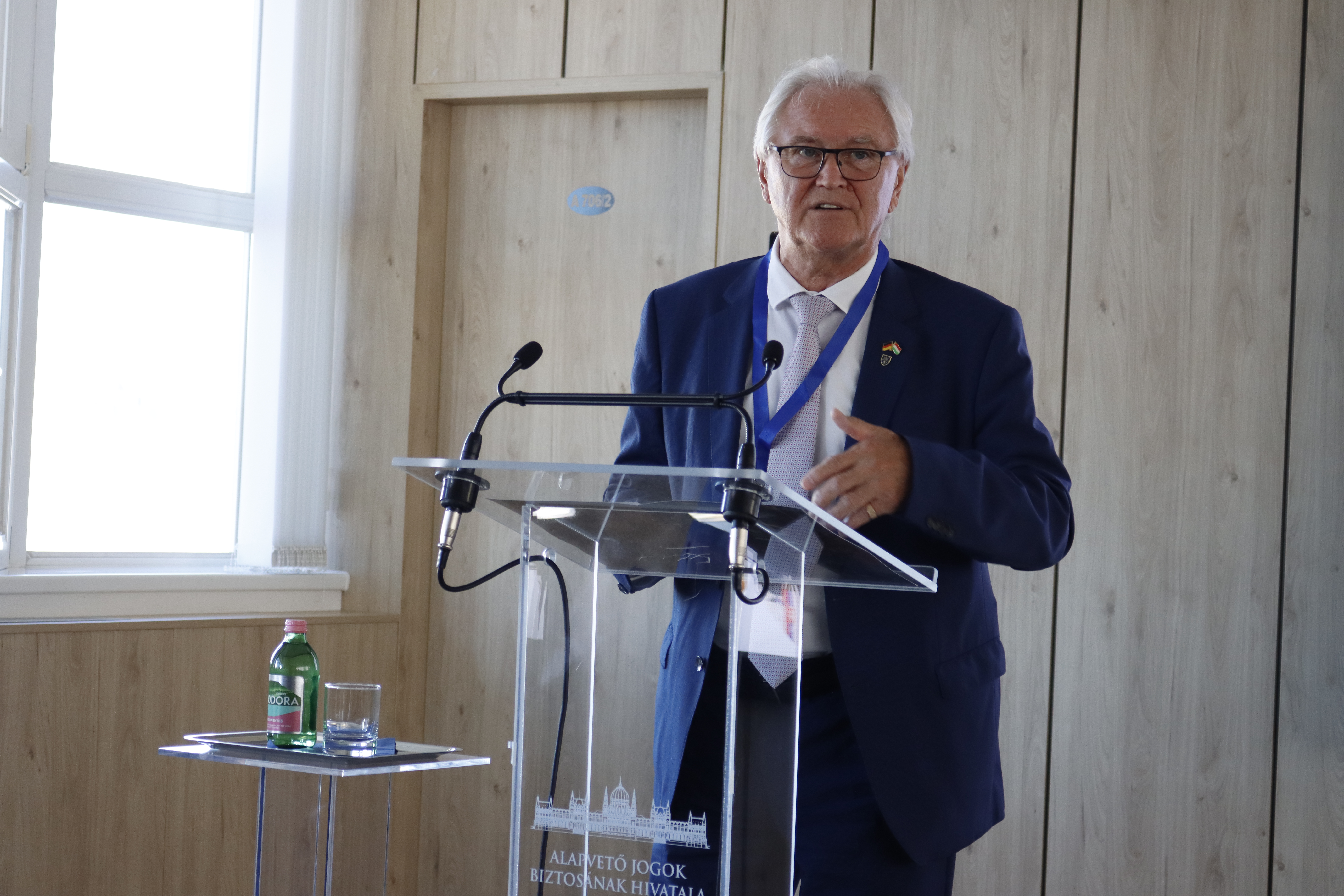 The conference participants were first welcomed by Ákos Kozma, Commissioner for Fundamental Rights and elected justice of the Constitutional Court, who emphasised that, as ombudsman, he had always been able to count on the excellent professional work of the Minority Ombudsman. As a token of his appreciation and gratitude, he awarded Elisabeth Sándor-Szalay the Justitia Regnorum Fundamentum prize.